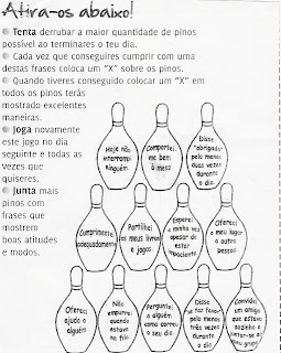 Em Formação Cívica vamos continuar a atirar pinos abaixo. Trata-se de acumular frases que mostrem boas atitudes e modos! No período passado quem ganhou este jogo foram os alunos: David Ventura e Jorge Oliveira, pois muitas vezes conseguiram derrubar a totalidade de pinos durante a semana!